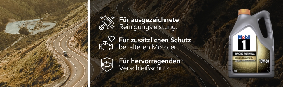 Mobil 1 10W-60 wird mit einer eigenen Mischung von synthetischem Ultra High Performance Basisöl und einem genau ausgewogenen Additivsystem hergestellt. Dieses Produkt wurde entwickelt, um Ihrem Fahrzeug eine lange Lebensdauer, lang anhaltenden Schutz und Ihrem Motor eine höhere Laufleistung bieten zu können. Mobil 1 10W-60 schützt zudem die Dichtungen, was Öllecks verhindert, und bietet aussergewöhnliche Reinheit und entfernt bestehenden Schlamm. Durch eine hohe Viskosität wird das Verbrennen von Öl bei älteren Motoren reduziert.