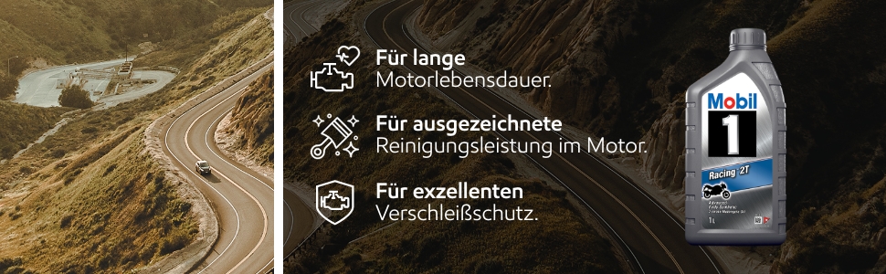 Mobil 1 Racing 2T ist ein fortschrittliches, vollsynthetisches 2-Takt-Motorenöl das höchste Schmieranforderungen für heutige leistungsstarke Motorräder, Schneemobile, Kettensägen mit magerem Öl / Kraftstoffverhältnis und anere 2-Takt Anwendungen erfüllt oder übertrifft.