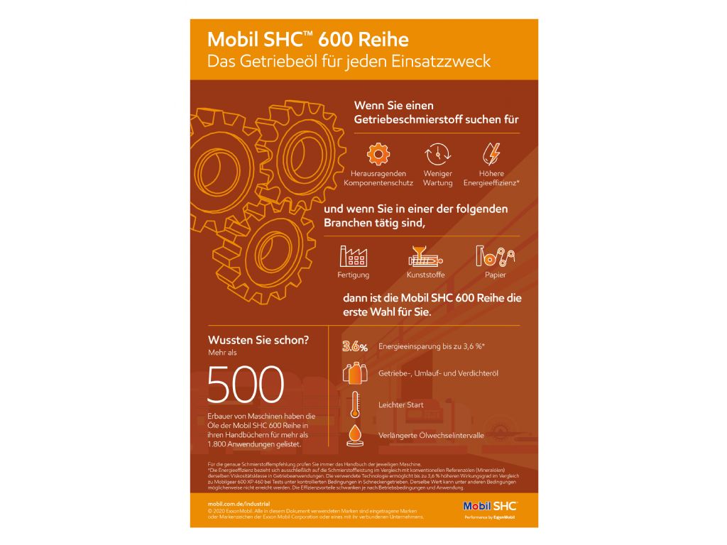 Schmierstoff auf der Basis synthetischer Kohlenwasserstoffe des Polyalphaolefin-Typus, entwickelt für Anwendungen, deren hohe Schmierungsanforderungen durch mineralische Öle nicht mehr abgedeckt werden können. Zeichnet sich insbesondere durch seine hervorragende Oxidationsstabilität, das ausgezeichnete Kältefliessverhalten, seine besonderen Schmiereigenschaften sowie das sehr günstige Viskositäts/Temperatur-Verhalten und seine Scherstabilität aus. Die Schmierstoffe der optimierten Mobil SHC 600-Reihe eigenen sich für ein breites Spektrum von Anlagen, nicht nur als Lösung für Probleme im Zusammenhang mit hohen Temperaturen.