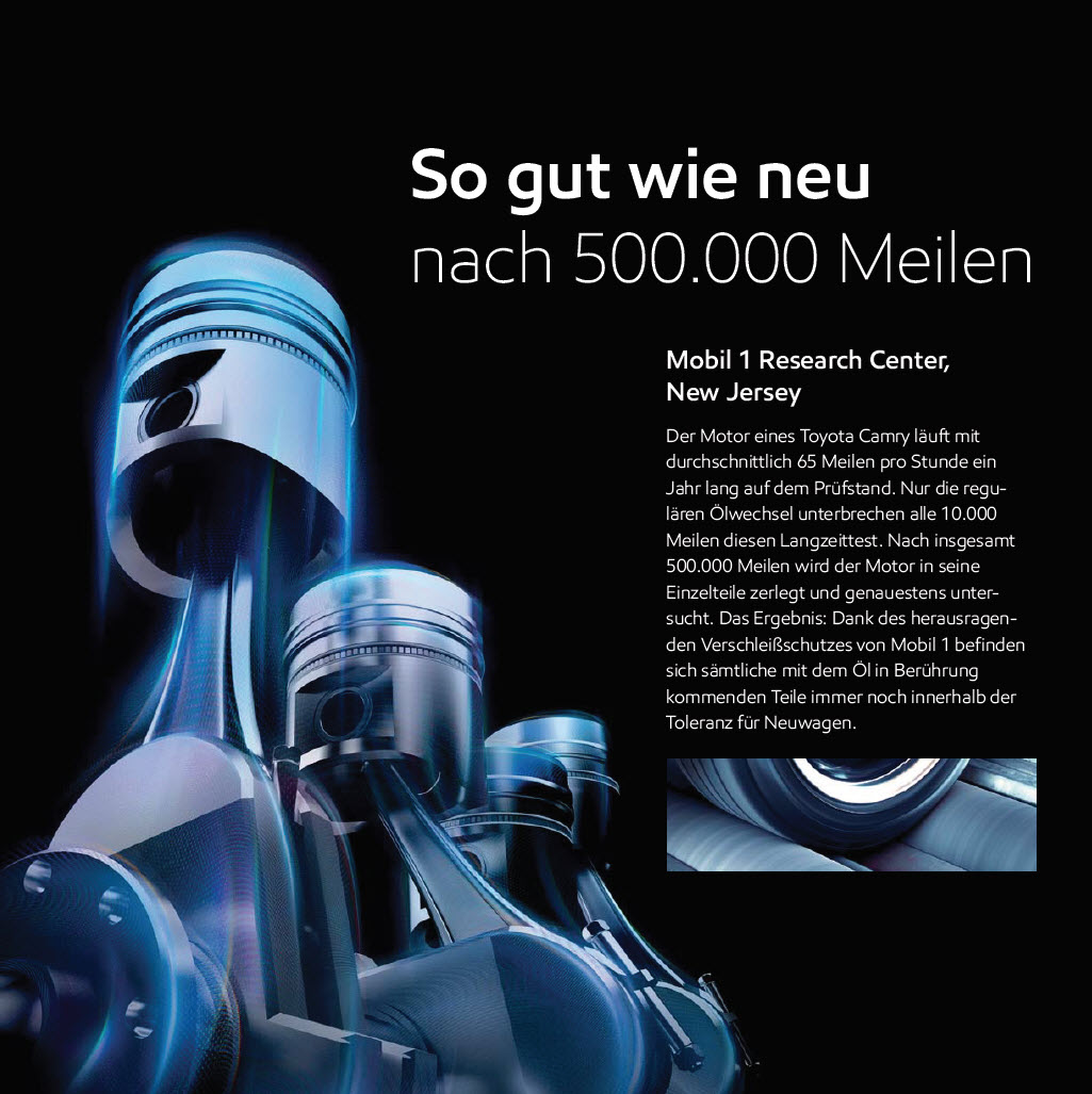 Fast dreimal so viele Inhaltsstoffe wie bei vergleichbaren Produkte werden optimal aufeinander abgestimmt, um die beiden bedeutendsten Produkteigenschaften von Mobil 1 zu gewährleisten: Schutz und Leistung von der ersten Motorumdrehung an.
