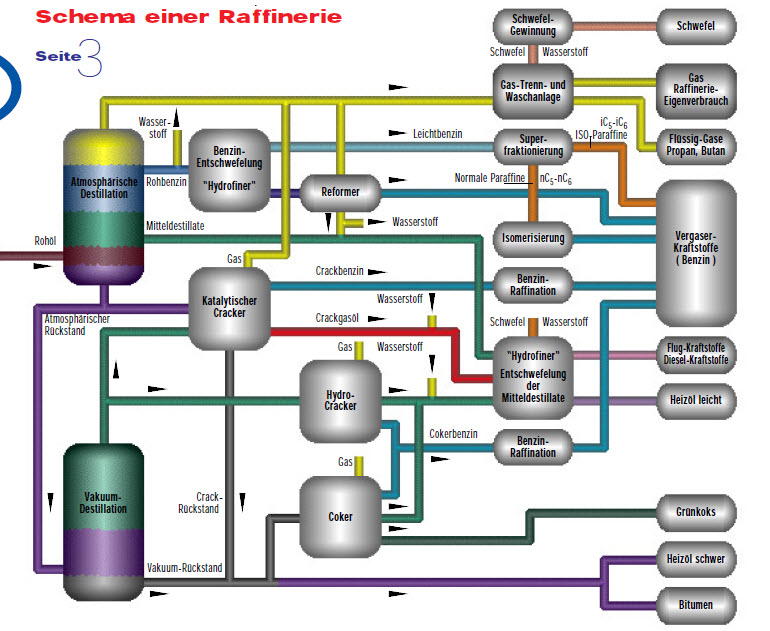 Rohöl ist ein Gemisch von Kohlenwasserstoffen. In Raffinerien werden daraus unterschiedliche Mineralölprodukte hergestellt, z.B.: Gas, Flüssiggase (Propan, Propylen, Butan, Butylen), Otto-, Flug-, Dieselkraftstoffe, leichtes und schweres Heizöl, Bitumen, Grünkoks, Kalzinat und Einsatzstoffe für die chemische Industrie. Ausserdem fällt Schwefel an. „Herstellen“ bedeutet dabei zunächst das Auftrennen der im Rohöl enthaltenen Kohlenwasserstoffe nach ihren Molekülgrößen in Gruppen ungefähr gleicher Größe, die man „Fraktionen“ nennt. Weiter gehört dazu das Reformieren und Cracken unerwünschter Molekülgruppen in solche Produkte, die im Markt nachgefragt werden. Danach ist eine Reinigung aller dieser Fraktionen von unerwünschten Bestandteilen (z.B. von Schwefel) erforderlich, um die Qualität und Umweltverträglichkeit der Mineralölprodukte zu erhöhen. Es ist eine wahre Kunst, bei dieser Koppelproduktion die Raffinerien so zu steuern, daß ihr Herstellungsprogramm in Quantität und Qualität der Nachfrage entspricht. Der sorgsame Umgang mit der knappen Ressource Umwelt (Boden, Wasser, Luft) gehört zu diesem Steuerungsprozeß genauso wie die Orientierung an den Marktgegebenheiten. Die Anforderungen an eine Raffinerie und deren Produktpalette sind nach geographischer Lage unterschiedlich und schwanken zusätzlich mit den Jahreszeiten.