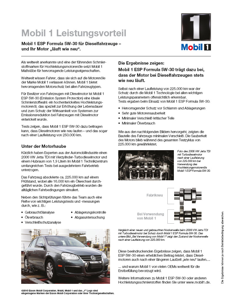 Als weltweit anerkannte und eine der führenden Schmierstoffmarken für Hochleistungsmotorenöle setzt Mobil 1 Massstäbe für hervorragende Leistungseigenschaften. Weltweit wissen Fahrer, dass sie sich auf die Motorenöle der Marke Mobil 1 verlassen können. Mobil 1 bietet hervorragenden Motorschutz bei allen Fahrzeugtypen. Für Besitzer von Fahrzeugen mit Dieselmotor ist Mobil 1 ESP 5W-30 (Emission System Protection) eine ideale Schmierstoffwahl: ein hochentwickeltes Hochleistungsmotorenöl, das speziell zur Erhöhung der Lebensdauer und zum Schutz der Wirksamkeit von Systemen zur Emissionsreduktion bei Fahrzeugen mit Dieselmotor entwickelt wurde.
