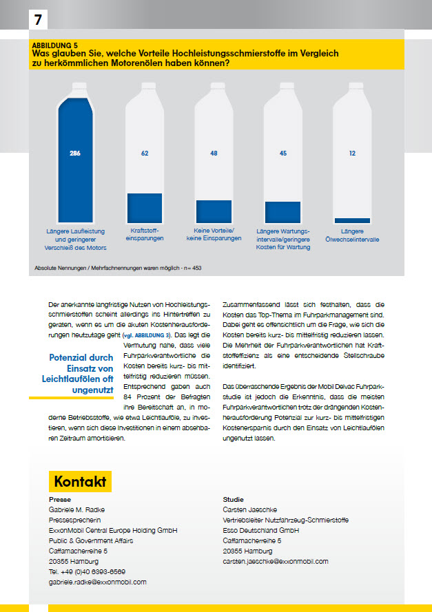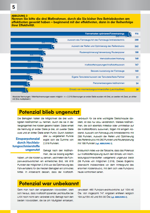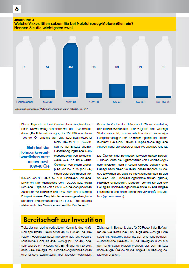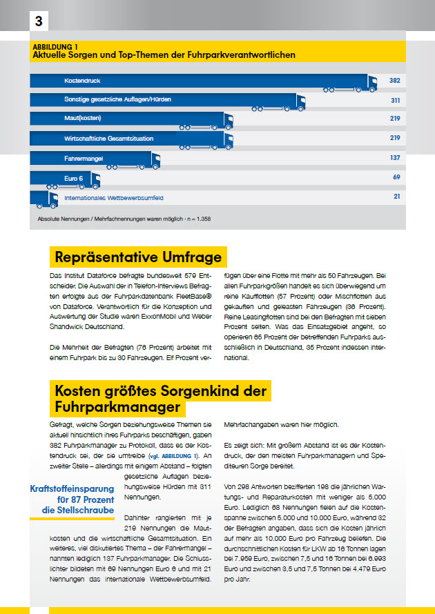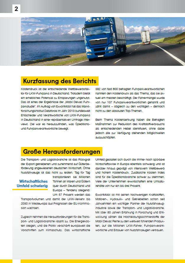 Kostendruck ist der entscheidende Wettbewerbsfaktor für LKW-Fuhrparks. Trotzdem bleibt ein erhebliches Potenzial zu Einsparungen ungenutzt. Das ist eines der Ergebnisse der „Mobil Delvac Fuhrparkstudie“. Im Auftrag von ExxonMobil hat das Marktforschungsinstitut Dataforce im Jahr 2013 bundesweit Entscheider und Verantwortliche von LKW-Fuhrparks in Deutschland in einer repräsentativen Umfrage interviewt. Ziel war es herauszufinden,was Speditions- und Fuhrparkverantwortliche bewegt.