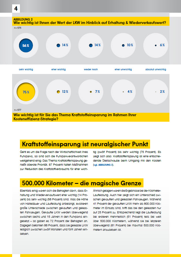 382 von fast 600 befragten Fuhrparkverantwortlichen nannten den Kostendruck als das Thema, das sie aktuell am meisten beschäftigt. Der Fahrermangel wurde von nur 137 Fuhrparkverantwortlichen genannt und zählt damit – obgleich zu den wichtigen – dennoch nicht zu den absoluten Top-Themen. Beim Thema Kostensenkung haben die Befragten Massnahmen zur Reduktion des Kraftstoffverbrauchs als entscheidenden Hebel identifiziert,ohne dabei jedoch alle zur Verfügung stehenden Möglichkeiten auszuschöpfen.