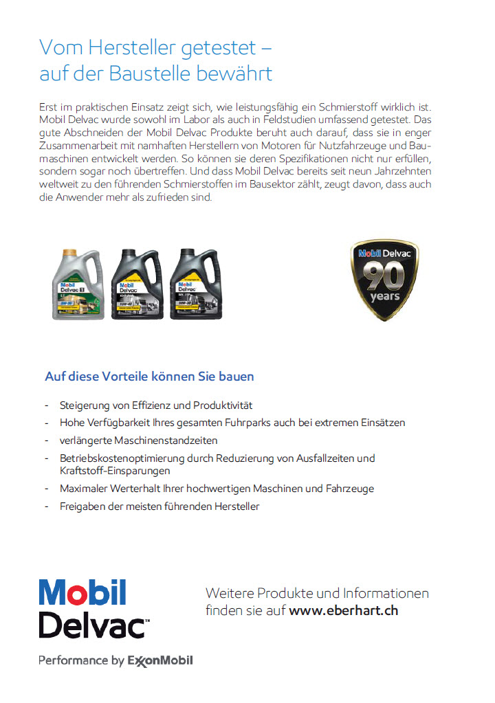 Das gute Abschneiden der Mobil Delvac Produkte beruht auch darauf, dass sie in enger Zusammenarbeit mit namhaften Herstellern von Motoren für Nutzfahrzeuge und Baumaschinen entwickelt werden. So können sie deren Spezifikationen nicht nur erfüllen, sondern sogar noch übertreffen. Und dass Mobil Delvac bereits seit neun Jahrzehnten weltweit zu den führenden Schmierstoffen im Bausektor zählt, zeugt davon, dass auch die Anwender mehr als zufrieden sind.