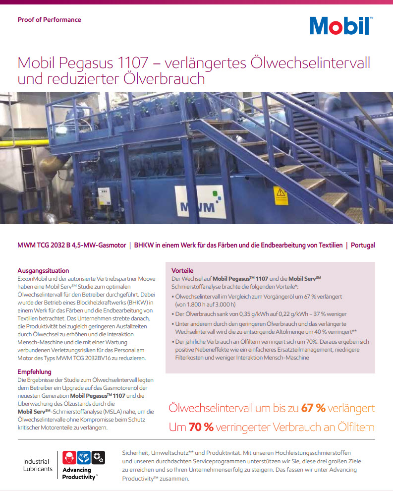 ExxonMobil hat eine Mobil Serv Studie zum optimalen Ölwechselintervall für einen Betreiber durchgeführt. Dabei wurde der Betrieb eines Blockheizkraftwerks (BHKW) in einem Werk für das Färben und die Endbearbeitung von Textilien betrachtet. Das Unternehmen strebte danach, die Produktivität bei zugleich geringeren Ausfallzeiten durch Ölwechsel zu erhöhen und die Interaktion Mensch-Maschine und die mit einer Wartung verbundenen Verletzungsrisiken für das Personal am Motor des Typs MWM TCG 2032BV16 zu reduzieren.